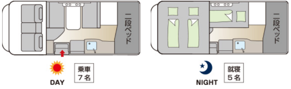 乗車定員7名(ディーゼル4WDは6名) / 就寝定員5名