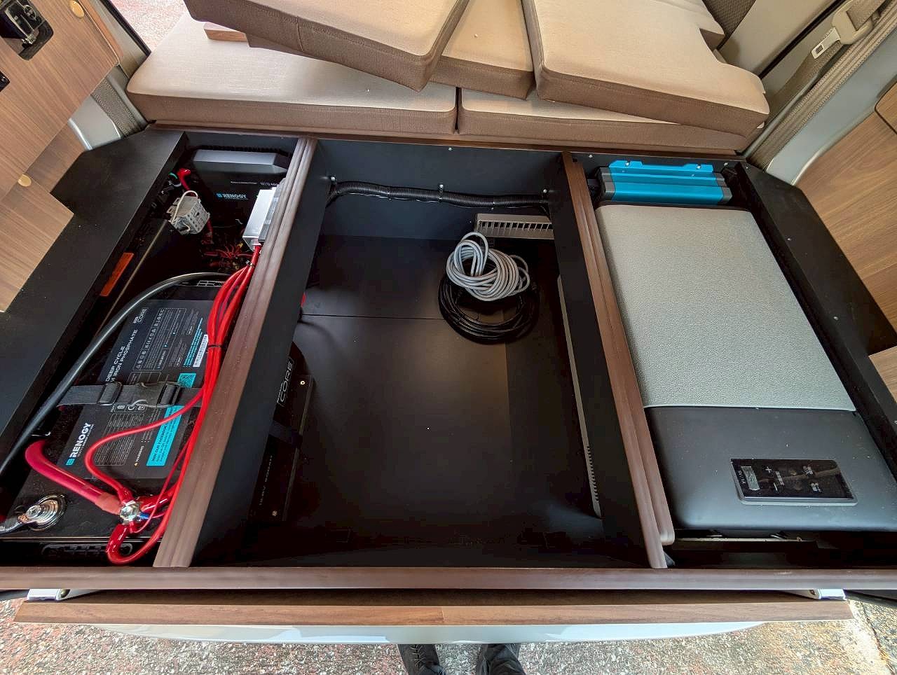 重要な電装系装備は1500Wインバーター・40A走行充電器・デジタルバッテリーモニター・105Ahサブバッテリー・室内のAC100VコンセントとDC12Vソケット・USBポート、外部電源入力と車外に電源を供給する出力コードまで。