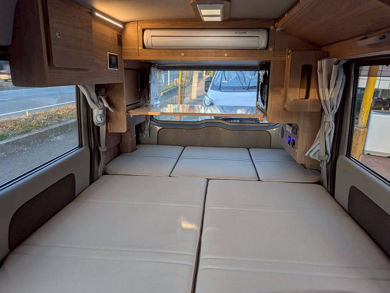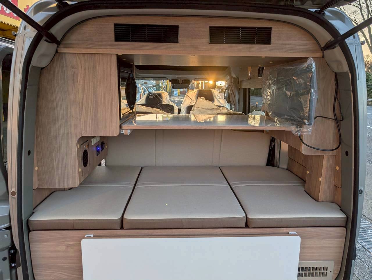 これらすべて標準装備でご用意しました。そして圧倒的広さのフルフラットモードでの たて190cm 最大幅136cmの余裕空間が自慢です!ベッドマットはハニカム構造採用の軽量・高強度で耐アルコール性能と防汚性能にすぐれた生地を採用しており後部座席の背もたれの後ろにすっきり収納可能です。