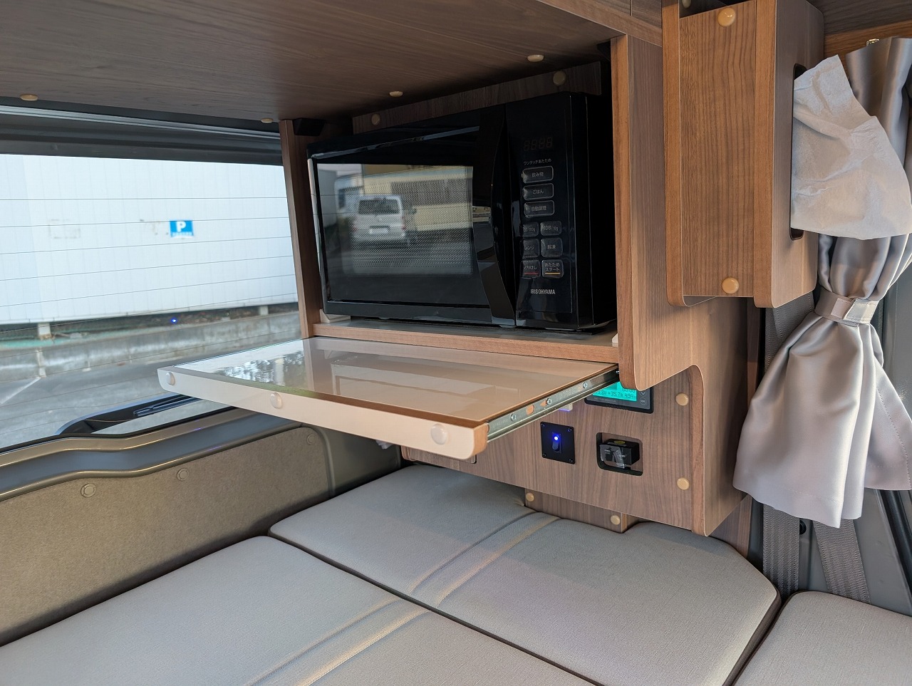 後部居住空間には電子レンジ・冷蔵庫・セラミックヒーター・テレビモニター・換気ファン・開閉式大型バニティミラー・調光式LED室内照明 さらに車内/車外共通の大型メインテーブルに引き出し式レンジテーブル&車外専用折りたたみ式ピクニックテーブルと「使える!」テーブルが3種類!