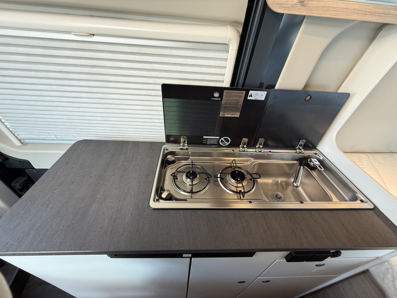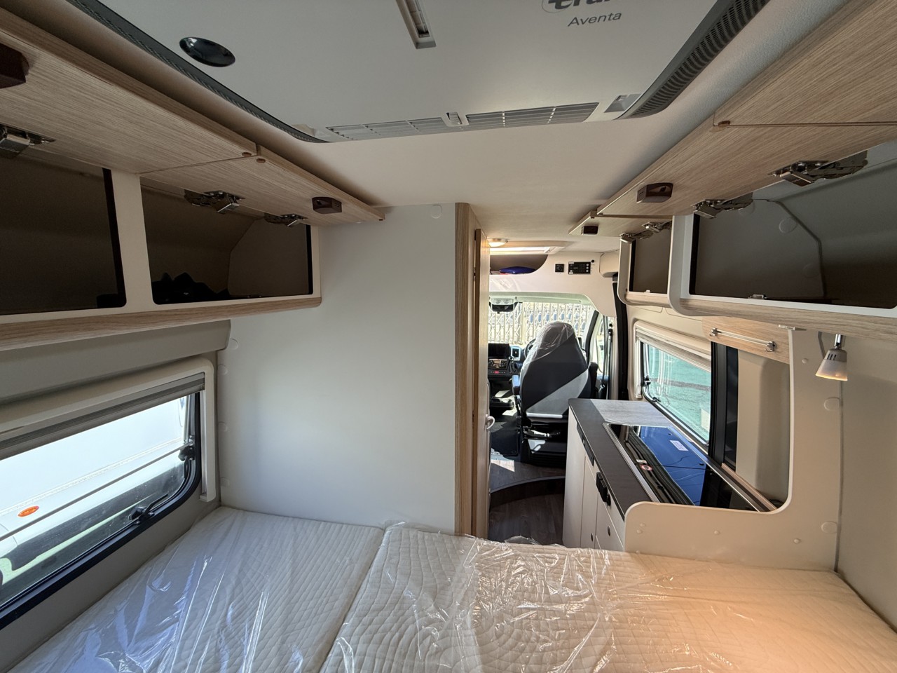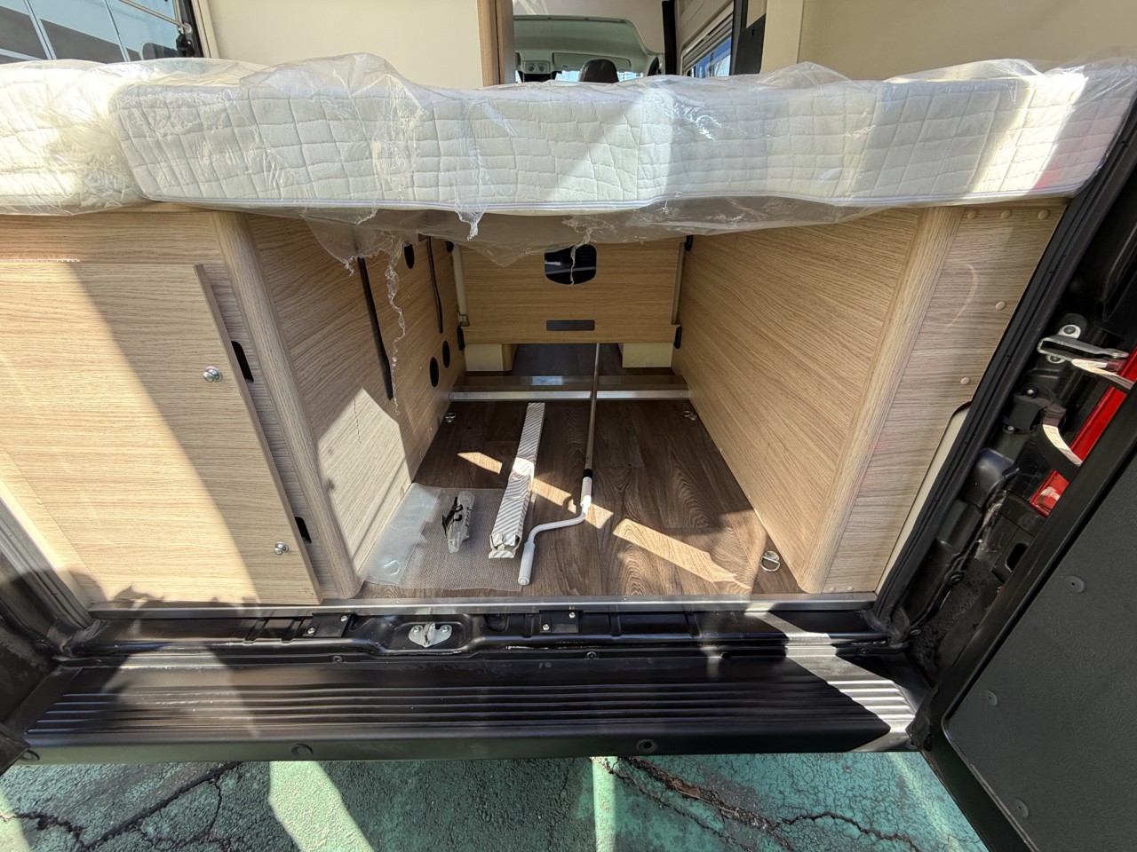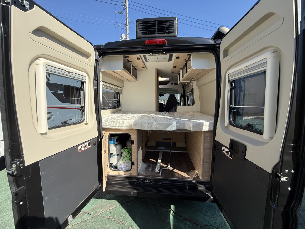 就寝スペースはダイネットのゲスト用とリヤの2カ所。リヤベッドは壁際に跳ね上げ、上げて収納をお使いください。