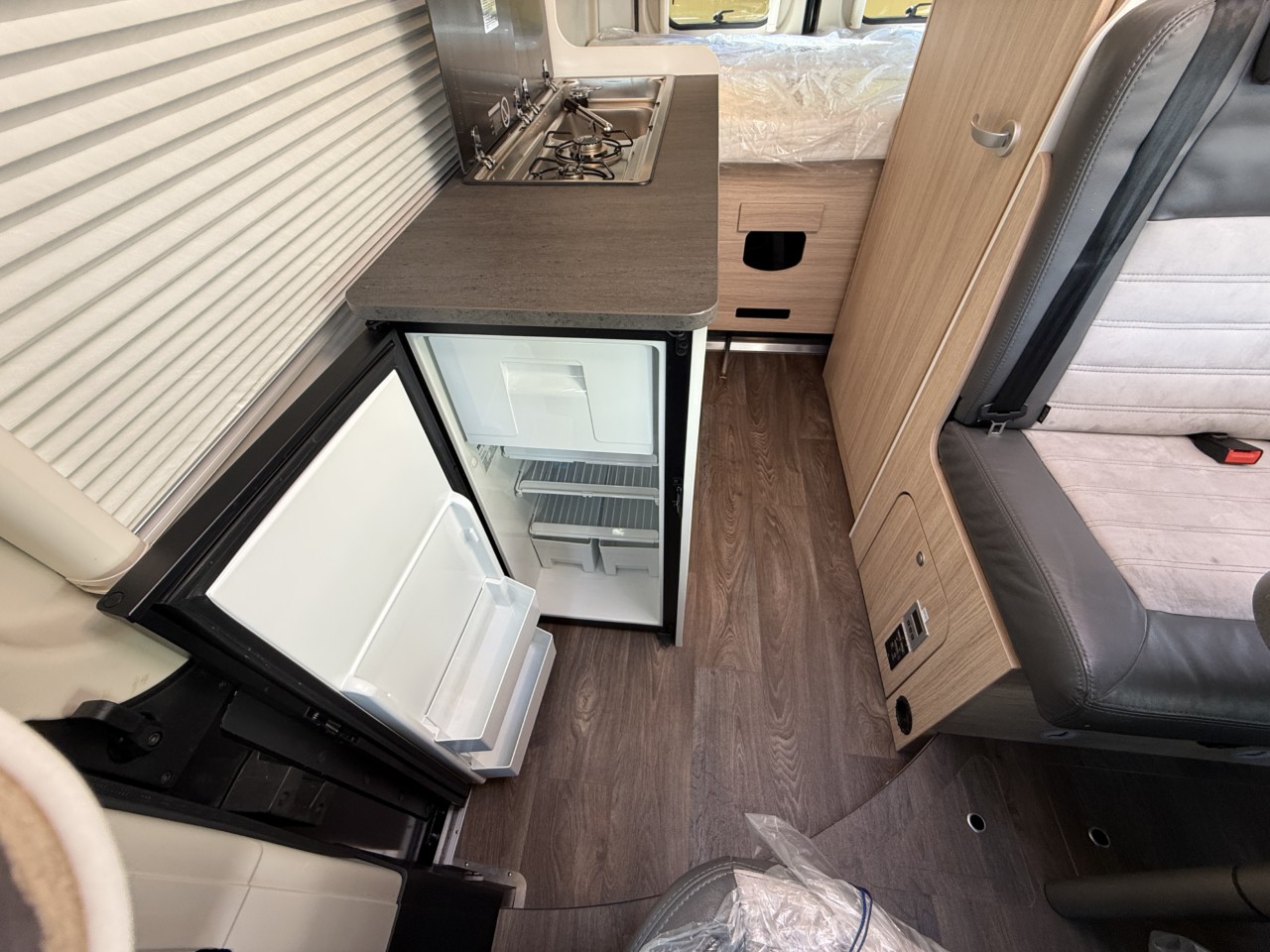 スライドドア横はキッチンスペースで、84ℓ冷蔵庫、シンク、コンロをあるので色々な可能性があります。