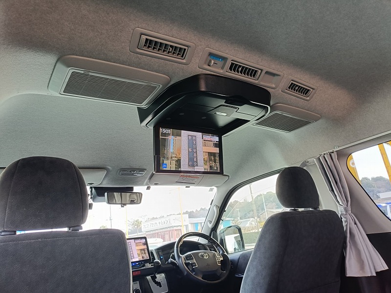 エンジンを止めていてもサブバッテリー駆動でフリップダウンモニターでテレビを視聴できます。