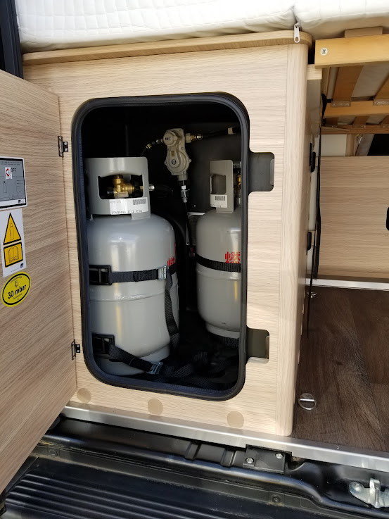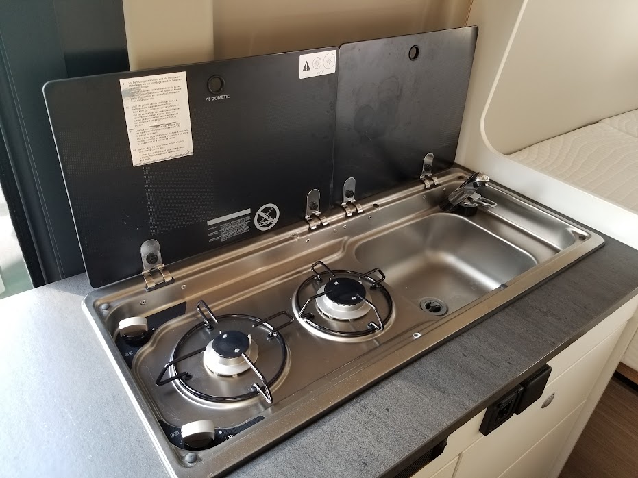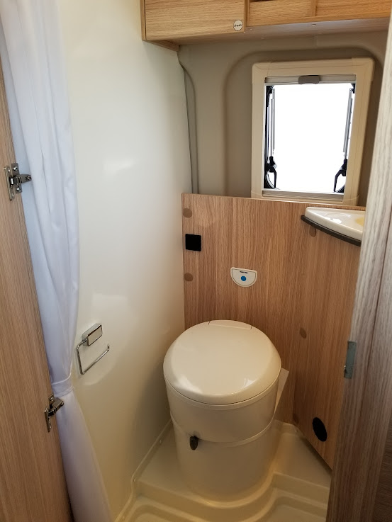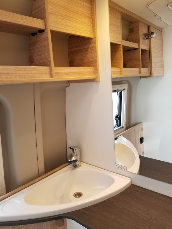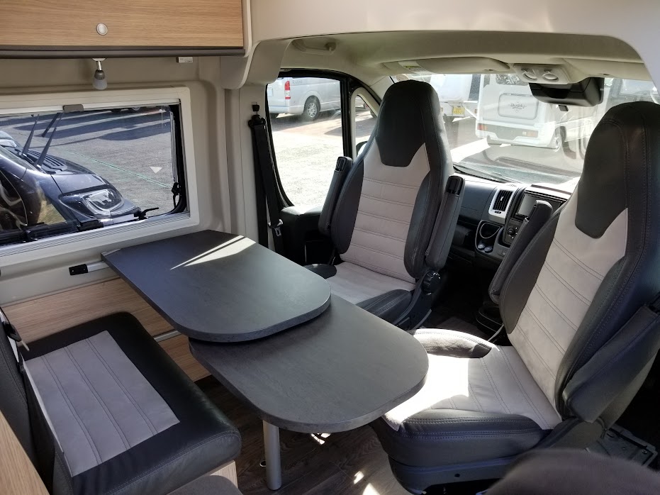 カセットトイレ、ヒーター&温水シャワー(ガス式)、常設コンロ、サイドオーニング、直前直左後方の3方向カメラ&モニターなど、大型モーターホームに並ぶ装備が搭載されています。