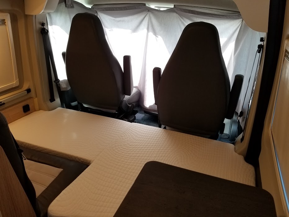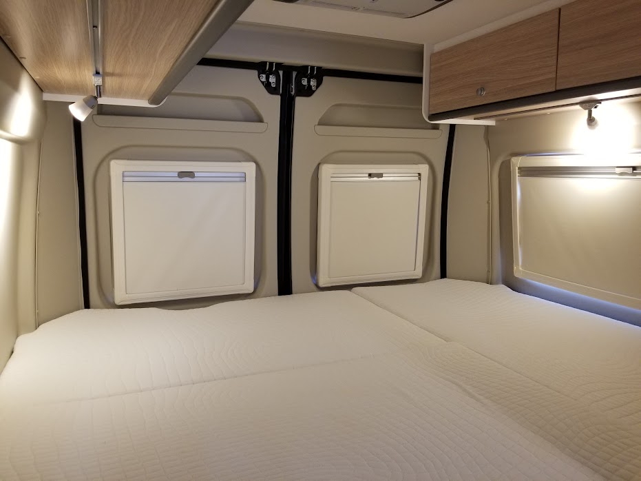 室内後方には大人2名まで就寝可能なダブルベッドを常設でき、さらにセカンドシートを展開してエクストラベッドを設置すれば、最大3名就寝可能です。