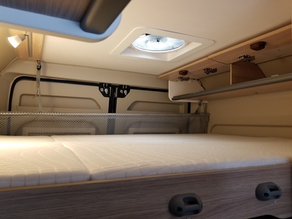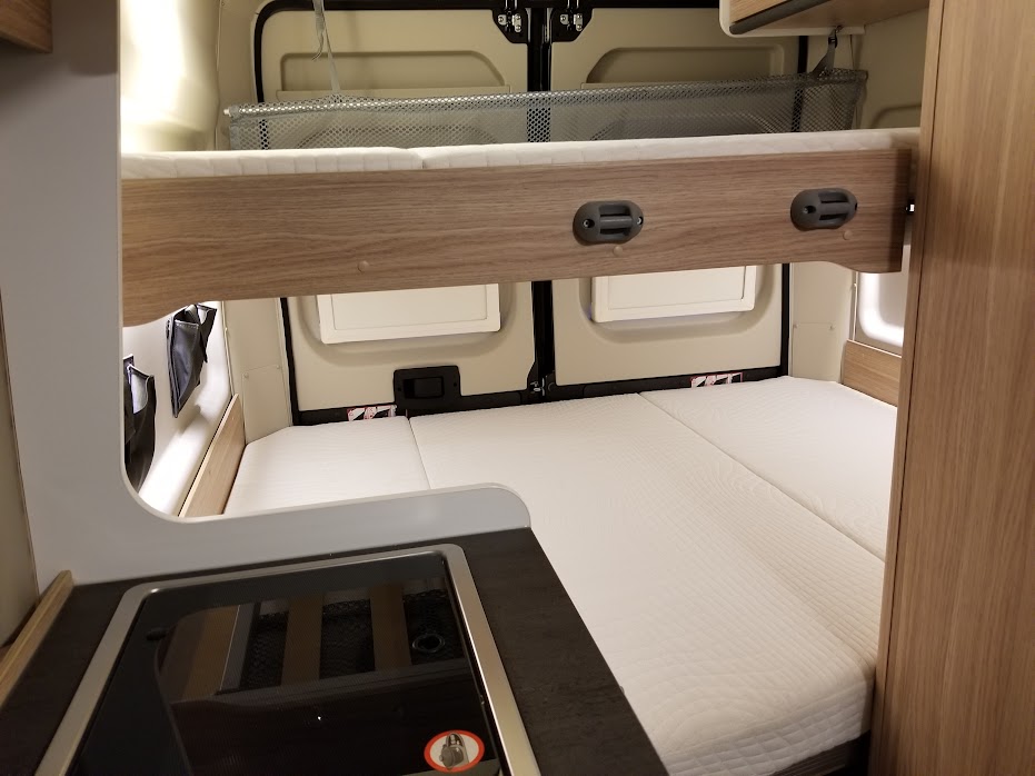 室内後方には大人4名まで就寝可能な2段ベッドを常設、さらにセカンドシートを展開してエクストラベッドを設置すれば、最大5名就寝可能です。