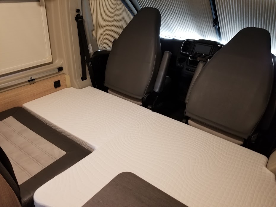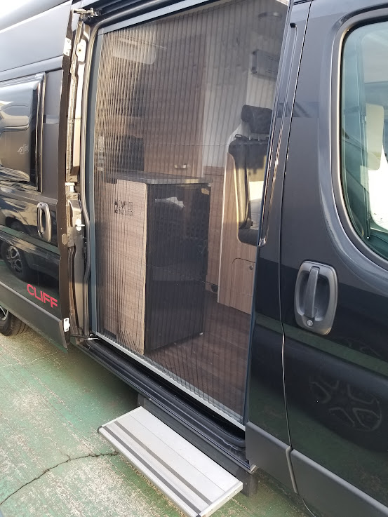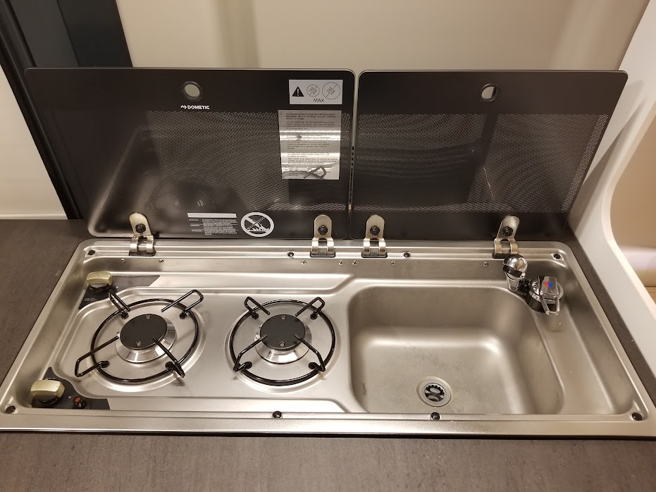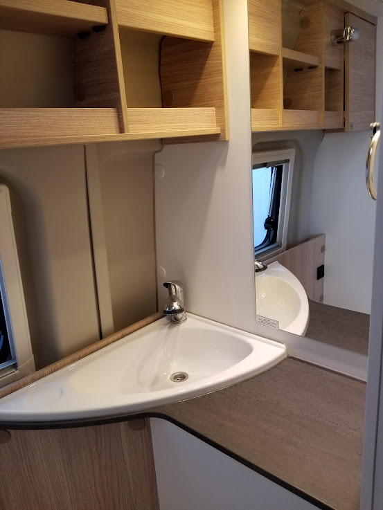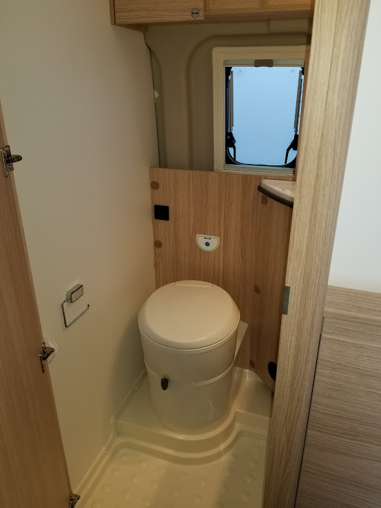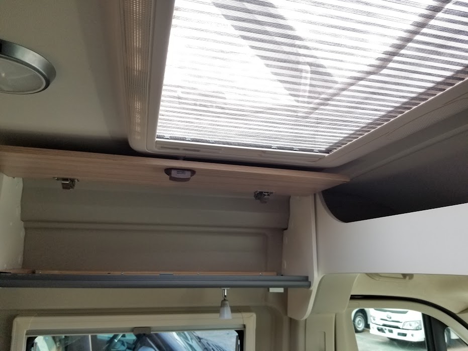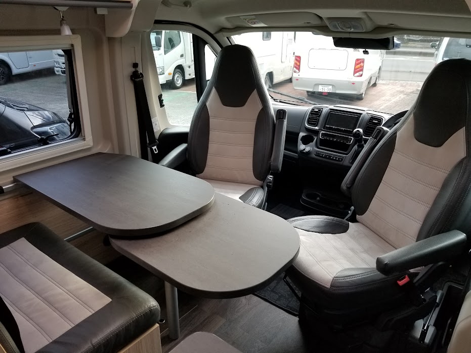 カセットトイレ、ヒーター&温水シャワー(ディーゼル式)、常設コンロ、サイドオーニング、直前直左後方の3方向カメラ&モニターなど、大型モーターホームに並ぶ装備が搭載されています。