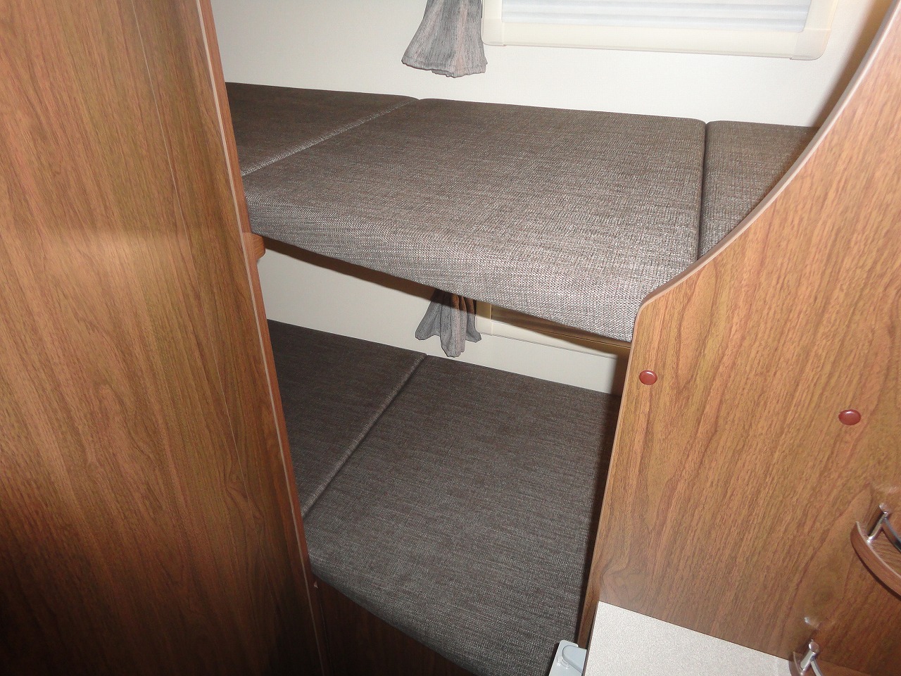 2段ベッドのレイアウトは大人5名が就寝可能で、2段ベッド下の大型収納にはキャンプ道具もすんなり収まる収納力も備えており、バランスの取れたレイアウトです。