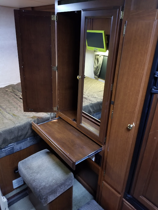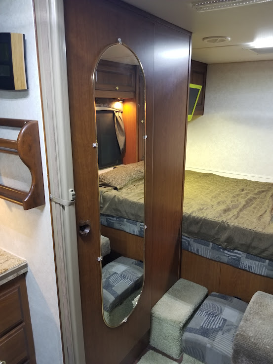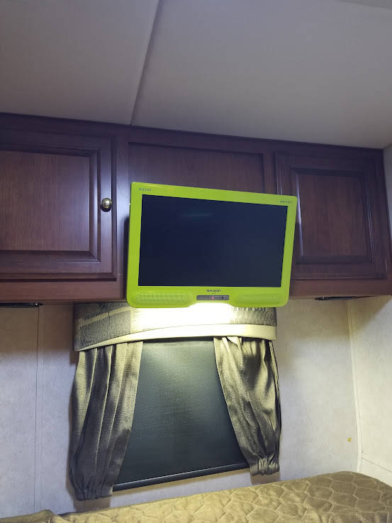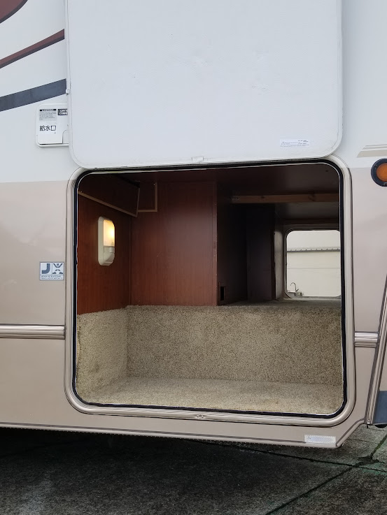 又、こちらの車両は、標準装備のルーフマウント電動サイドオーニング、リモコン操作電動カーテン、電動排水バルブ2基、リビングとベッドルームに1台ずつのテレビ、ウォシュレット付きトイレ、オプションのソーラーパネル装備済みの車両です。