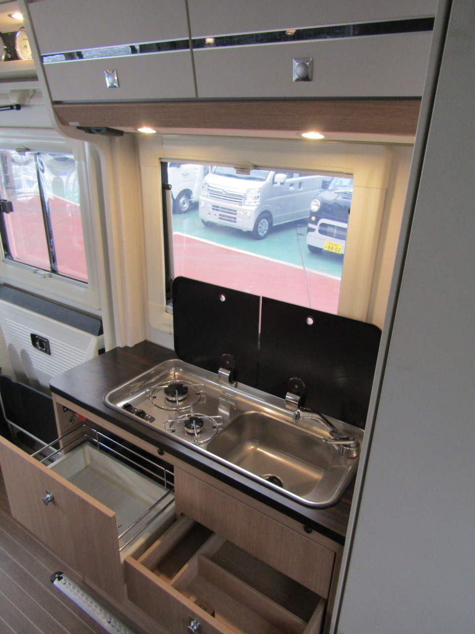 FFヒーターは軽油式、ビルドインタイプのコンロはカセットガスを使用します♪コンビニですぐ手に入るので手間がいりませんね!