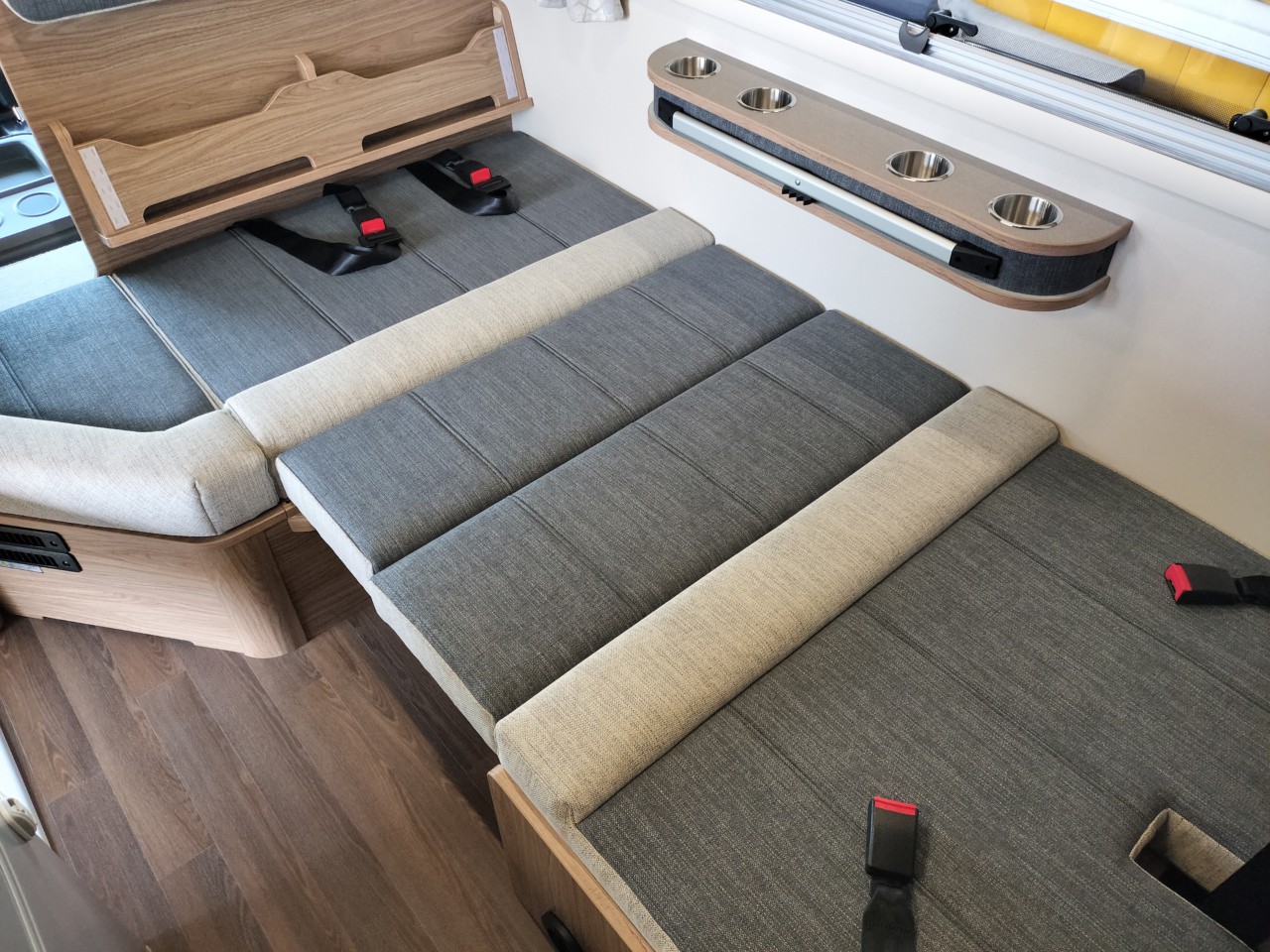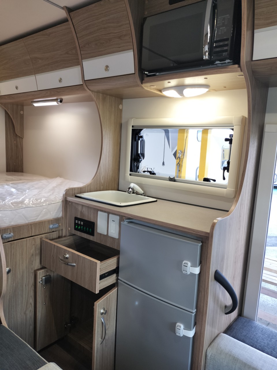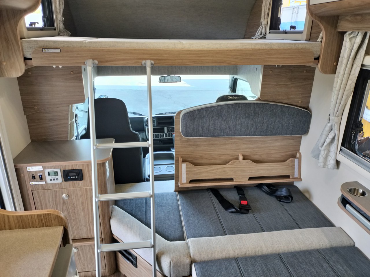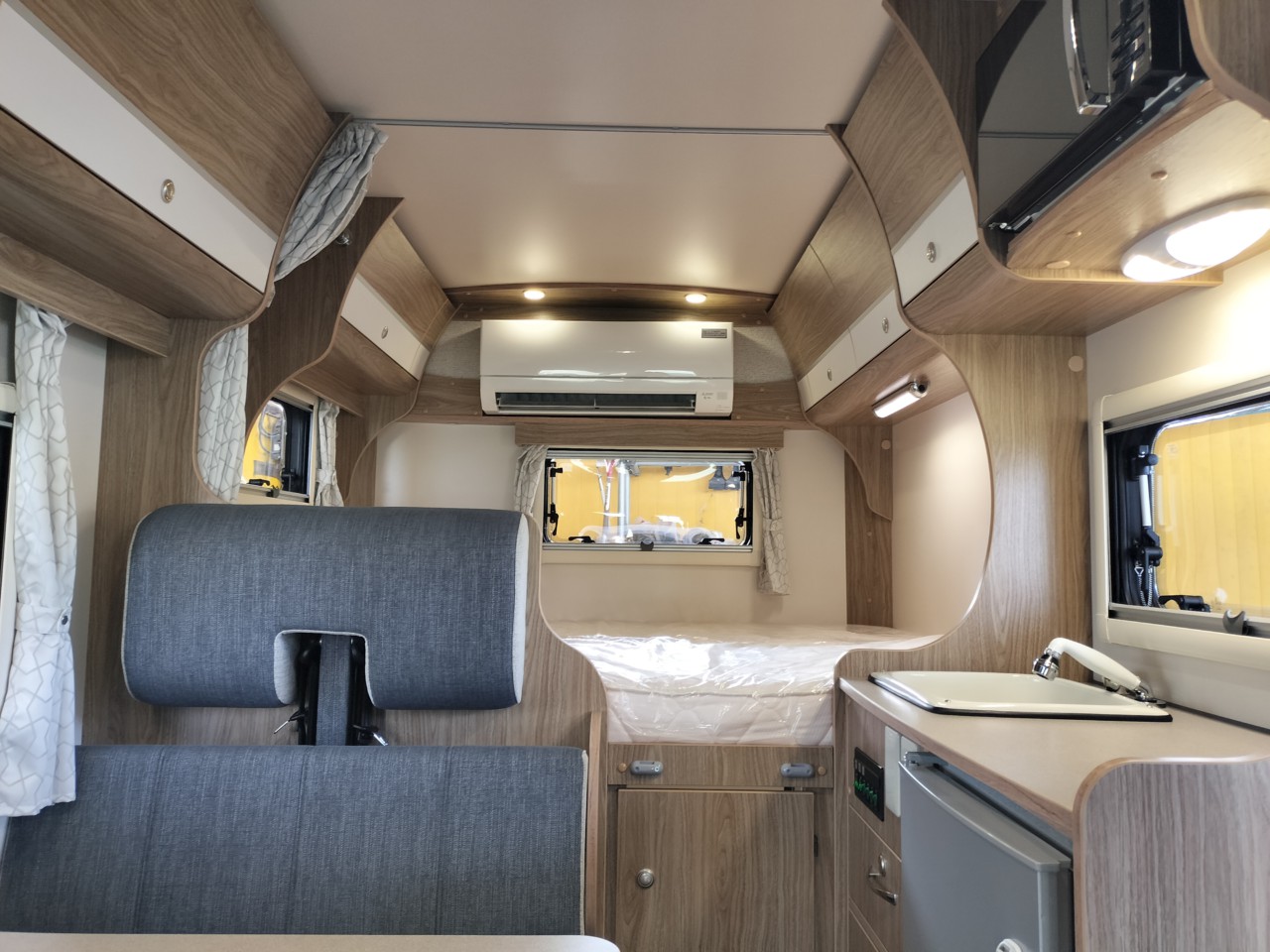 ダブルベッドタイプですので、広々とくつろいで頂くことが出来ます。また、トリプルサブバッテリーにより、エンジン停止状態でもエアコン、冷蔵庫、電子レンジが使用できます!