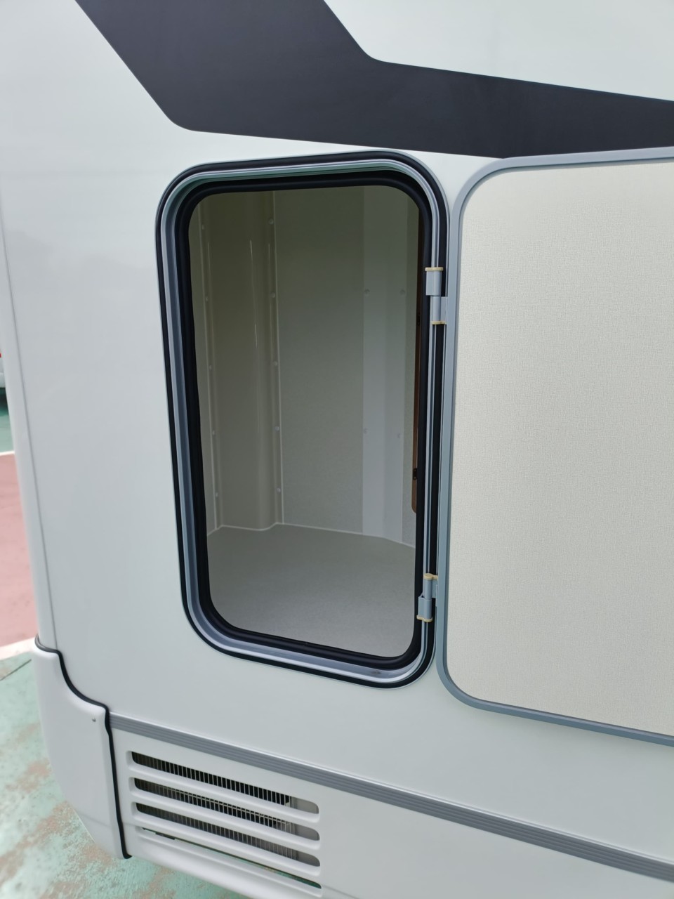 モビーDCはリアドア仕様。通路が長く居住空間が一番広いです。それでいてフリールームのサイズも大型です。