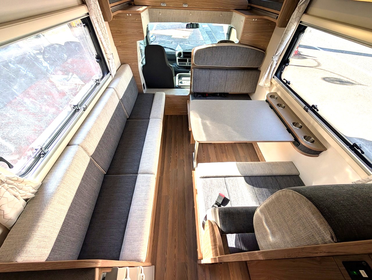 室内中央の大型テーブルを対座シートと横掛けソファーで囲んだリビングは、家庭用エアコンの風も心地よく当たるくつろぎの空間です。