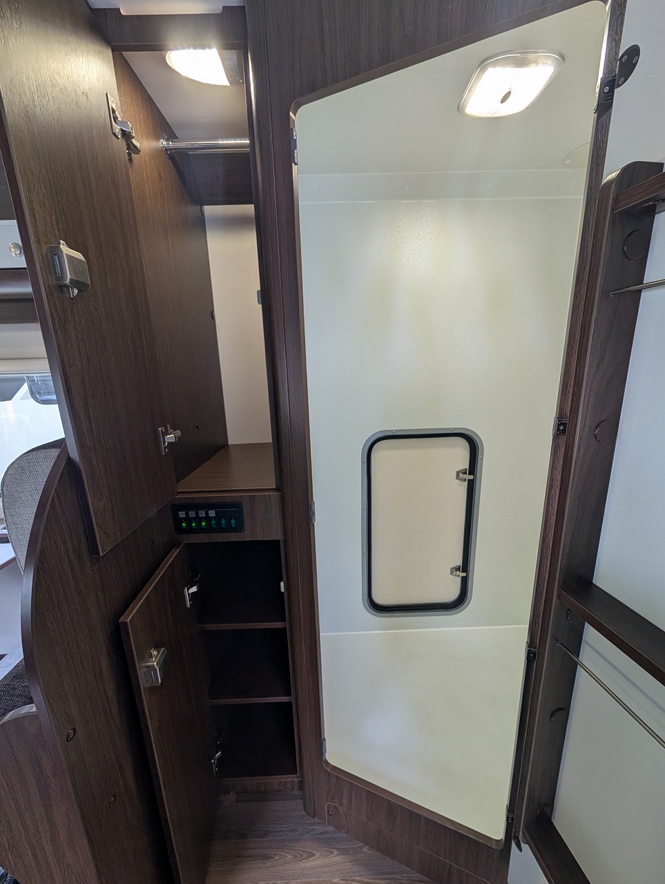 フリールーム横にはクローゼットと棚もございます。その他にも、キャビネット収納、下駄箱、ソファー下の収納など収納スペースもしっかりとあるお車です♪