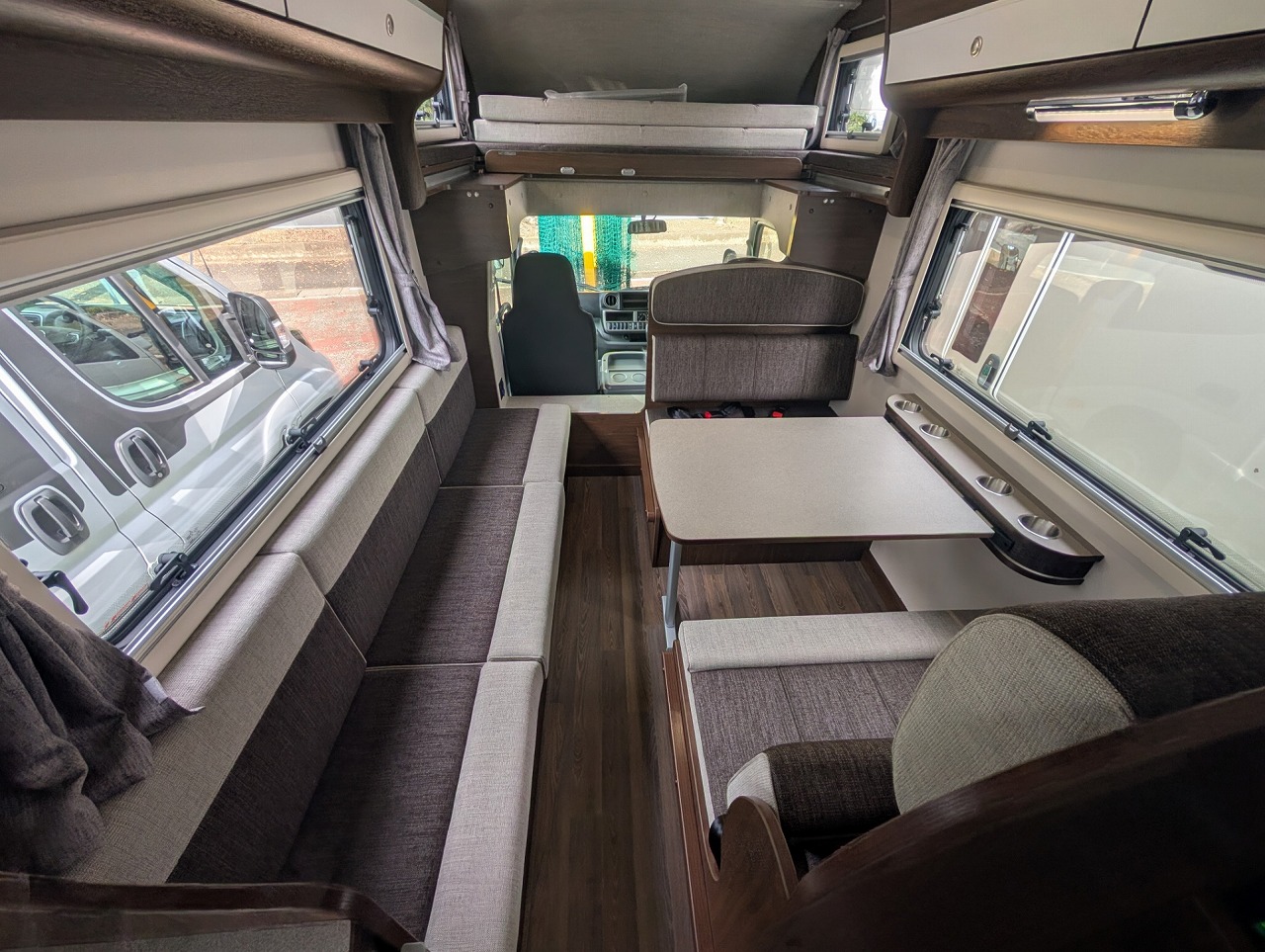 室内中央の大型テーブルを対座シートと横掛けソファーで囲んだリビングは、家庭用エアコンの風も心地よく当たるくつろぎの空間です。