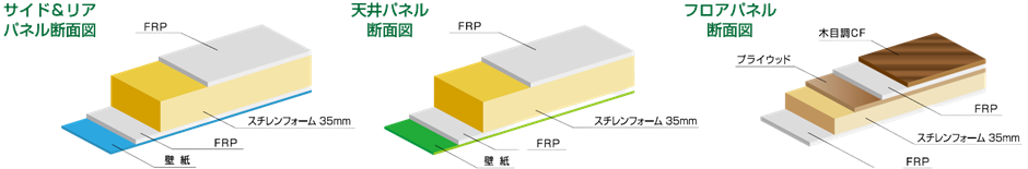 軽量化および、腐食しない素材構成に見直しをしました。 - ・天井面はFRP一体成型+ベニヤ板の構成からパネル方式に変更。FRPパネルはドイツラミルクス社製を採用。